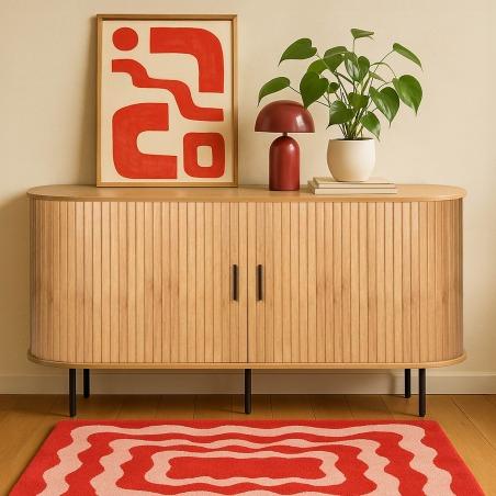 Entdecken Sie unser prächtiges niedriges Sideboard mit zwei Türen, ein Möbelstück, das Eleganz und Funktionalität im Bohème-Stil vereint. Mit seinen großzügigen Abmessungen von 140 cm Breite, 76 cm Höhe und 40 cm Tiefe ist dieses Sideboard so konzipiert, dass es sowohl Charme als auch optimale Aufbewahrungslösungen in Ihr Interieur bringt. Dieses Möbelstück besteht aus einem 18 mm dicken MDF-Rahmen und einer mit einer Melaminplatte überzogenen Platte und garantiert Langlebigkeit und Widerstandsfähigkeit gegenüber alltäglichen Gefahren. Die Türen sorgen für eine natürliche und warme Note, während die Stahlbeine mit schwarzem Epoxidharz-Finish eine moderne und raffinierte Note verleihen und dem Ganzen eine hervorragende Stabilität verleihen. Mit einer Tragfähigkeit von bis zu 30 kg ist dieses Sideboard ideal für die Aufbewahrung Ihrer Alltagsgegenstände, sei es für die Aufbewahrung von Geschirr, Büchern oder Dekorationselementen. Dank seines geräumigen Designs und der zwei Türen können Sie Ihre Sachen problemlos organisieren und gleichzeitig ein ordentliches und elegantes Erscheinungsbild bewahren. Dieses Sideboard ist in zwei Farben erhältlich – Naturholz und schickes Schwarz – und passt sich problemlos allen Einrichtungsstilen an, sei es im Wohnzimmer, im Esszimmer oder im Eingangsbereich.