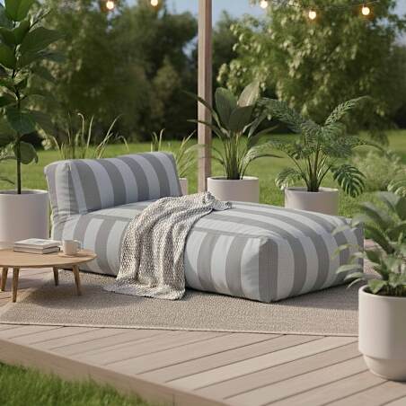 Verwandeln Sie Ihren Außenbereich mit unserer gestreiften Liege für modulare Gartenmöbel, die Funktionalität und Ästhetik vereint. Hergestellt aus hochwertigen Materialien, ist sie mit Edelstahl-Befestigungsringen ausgestattet, die für optimale Stabilität und Langlebigkeit sorgen. Der gestreifte Außenstoff aus massgefärbtem Polypropylen-Garn (Olefin) bietet eine hervorragende UV- und Wetterbeständigkeit und garantiert, dass Ihre Möbel im Laufe der Zeit ihren Glanz behalten. Darunter sorgt der Boden aus Polyester Oxford 500D mit PE-Beschichtung für zusätzlichen Schutz gegen Feuchtigkeit und Risse. Komfort und Haltbarkeit sind dank unseres 25 kg/m³ geschnittenen Polyether-Schaums gewährleistet, der optimalen Halt für Ihre Entspannungsmomente bietet. Außerdem ist der Stoff mit einer wasserabweisenden Behandlung versehen, die es Ihnen ermöglicht, Ihre Liege auch bei leichtem Regen sorgenfrei zu nutzen. Modular und elegant fügt sich diese Liege perfekt in alle Arten von Außenbereichen ein und verleiht Ihrem Garten oder Ihrer Terrasse einen Hauch von Komfort und Modernität. Gönnen Sie sich unvergessliche Entspannungsmomente mit diesem eleganten und widerstandsfähigen Möbelstück.Maße: Höhe 65 cm, Breite 85 cm, Länge 160 cm, Sitzhöhe 30 cm.