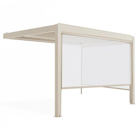 Die bioklimatische Wandpergola THEBES in elegantem Cremeton ist mit SPARTE-Verdunkelungsrollos (95 %) ausgestattet und ermöglicht es Ihnen, Ihren Außenbereich das ganze Jahr über komfortabel zu genießen. Die motorisierten, per Fernbedienung verstellbaren Lamellen bieten eine präzise Lichtregulierung, schützen zuverlässig vor Regen und sorgen für eine natürliche Belüftung an warmen Sommertagen. Gefertigt aus robustem, wetterfestem Aluminium, misst die Pergola 3 x 4 x 2,5 Meter und überdacht bis zu 12 m² Terrassenfläche. Sie fügt sich harmonisch in jede Fassade ein und überzeugt durch ihre Kombination aus Eleganz und Funktionalität. Praktische Details wie integrierte Dachrinnen für effiziente Regenwasserableitung und eine umlaufende LED-Beleuchtung schaffen eine stimmungsvolle Atmosphäre für entspannte Abende im Freien. Für eine sichere Installation wird empfohlen, einen Fachmann zu beauftragen, einen Mindesttraufabstand von 2,60 m einzuhalten und die elektrischen Normen NFC-15-100 zu beachten.