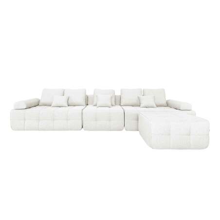 Das 5-Sitzer-Stoffsofa SNUGGY besteht aus zwei modularen Seitenelementen (B 282 x T 112 x H 65 cm, Sitzhöhe 41 cm), einem zentralen 1-Sitzer-Modul (B 83 x T 112 x H 66 cm, Sitzhöhe 41 cm) und einem Hocker (83 x 83 x 40 cm, Sitzhöhe 42 cm), der als Chaiselongue oder Fußhocker genutzt werden kann. Alle Elemente werden zusammen als harmonisches Ensemble verkauft. Jedes Modul verfügt über eine Konstruktion aus hochdichtem Schaumstoff (32 kg/m³) und Taschenfederkern mit rutschfester Unterseite, die dauerhaften Komfort, optimale Unterstützung und hervorragende Stabilität garantiert. Jeder Sitz trägt bis zu 110 kg und gewährleistet so Robustheit und Sicherheit im täglichen Gebrauch. Der Bezug aus Leinenimitat (95 % Polyester, 5 % Nylon, 340 g/m²) bietet eine weiche und strapazierfähige Haptik. Die abnehmbaren und waschbaren Bezüge der Rückenkissen, Zierkissen und des Hockers erleichtern die Pflege. Für eine einfache Lieferung und Montage ist das Sofa vakuumverpackt. Dieses modulare und individuell anpassbare Set vereint modernes Design, Stabilität und Komfort und schafft einen einladenden und behaglichen Raum – ideal für Ihr Wohnzimmer oder Ihre Entspannungsecke.